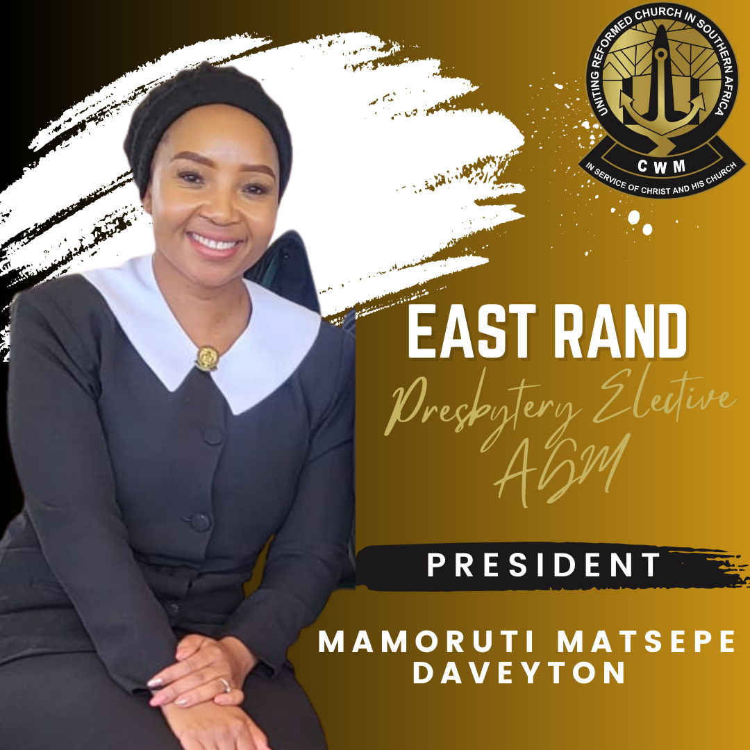 Juff Matsepe is elected as President of East Rand Presbytery CWM at the Elective AGM held on Saturday the 18th of November 2023 at URCSA Daveyton Wes. Congratulations to our mother and we wish her everything of the best and God's blessing.
